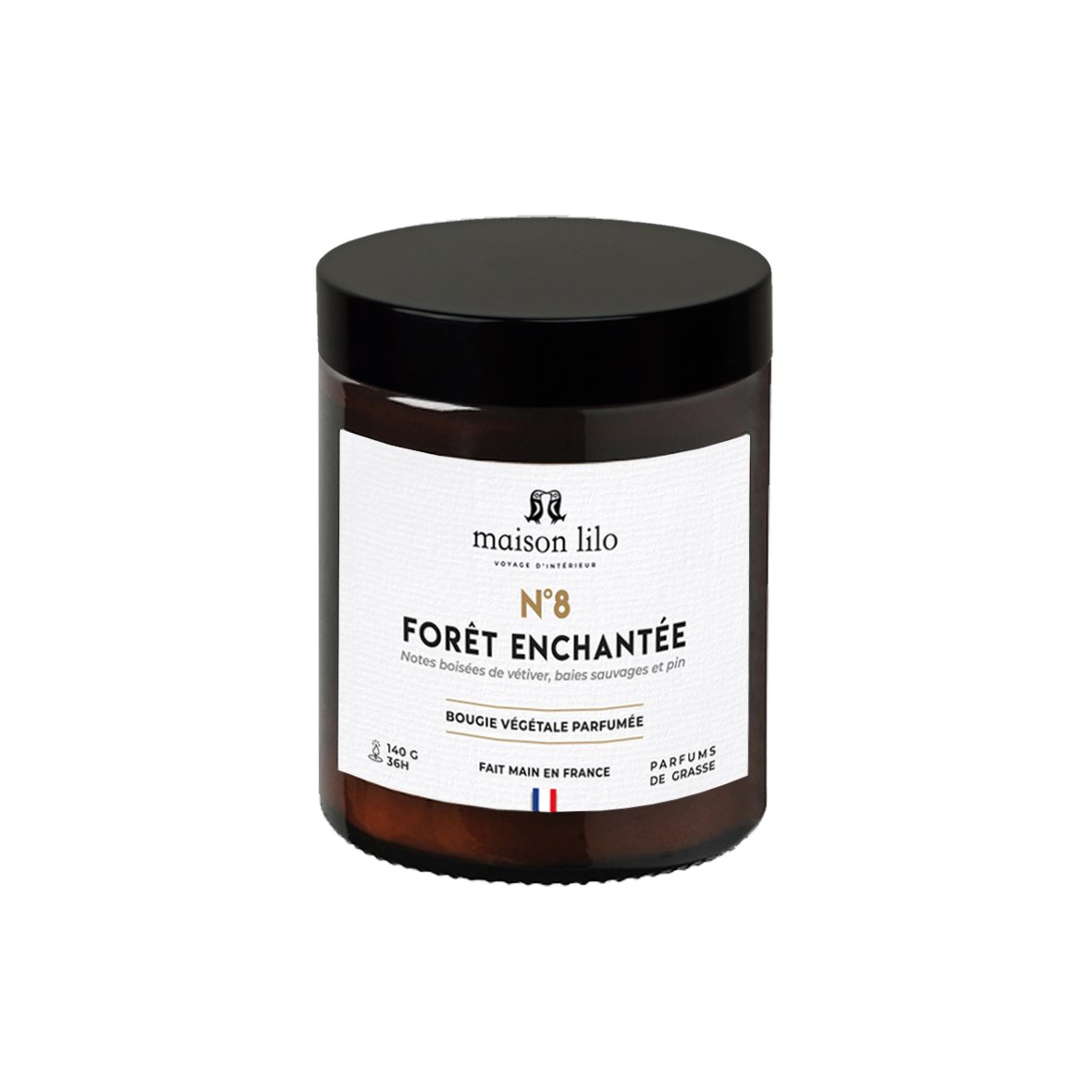 Cire végétale de soja eco-responsable (sans OGM ni pesticides), mèche coton, parfums naturels de Grasse.