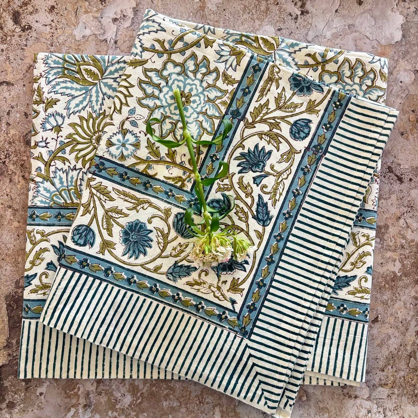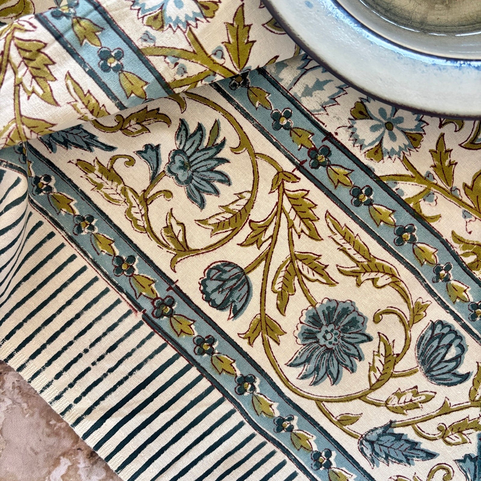 Nos nappes sont imprimées en toutes petites séries dans l’atelier familial de notre fabricant à Jaipur selon la technique ancestrale du blockprint (impression au tampon de bois).