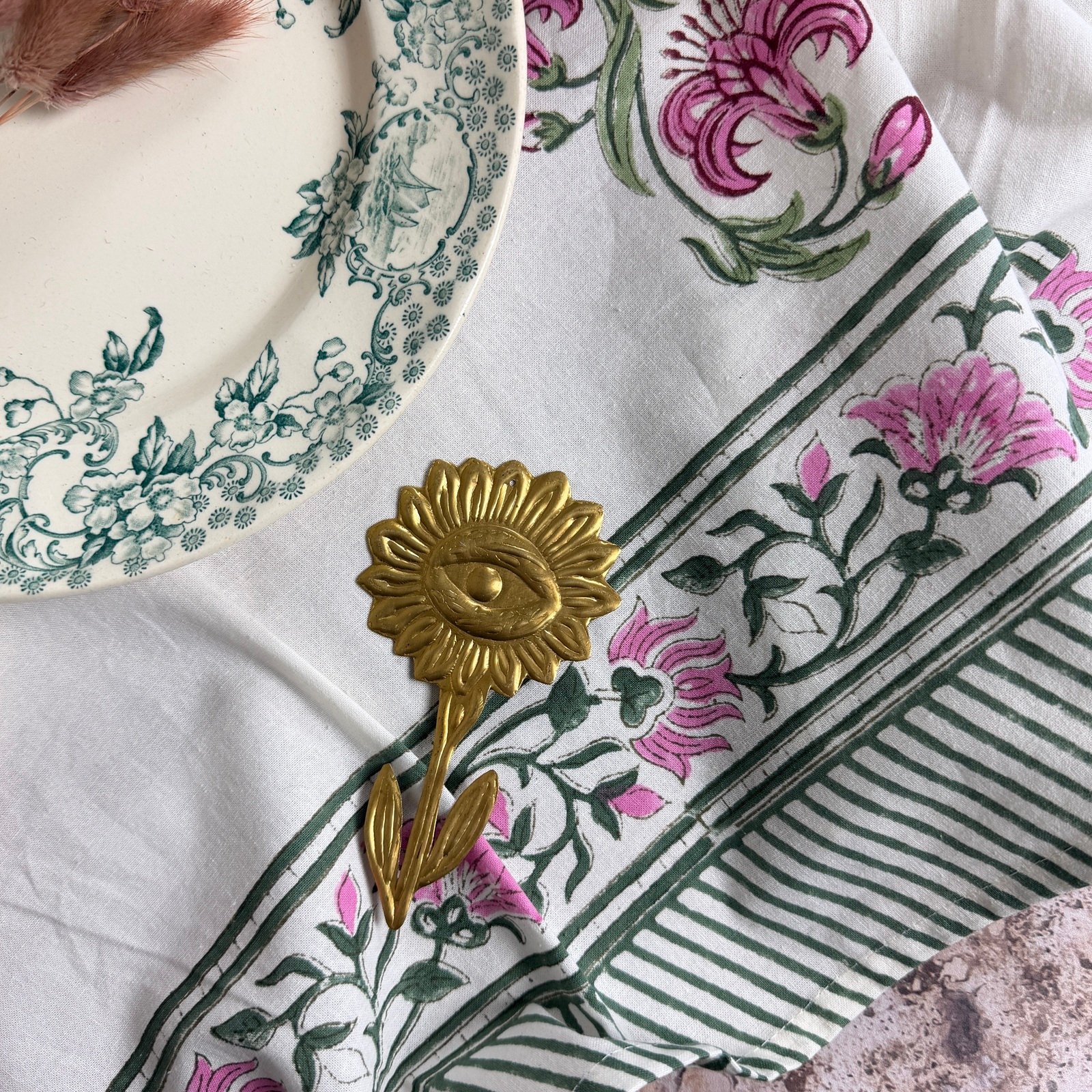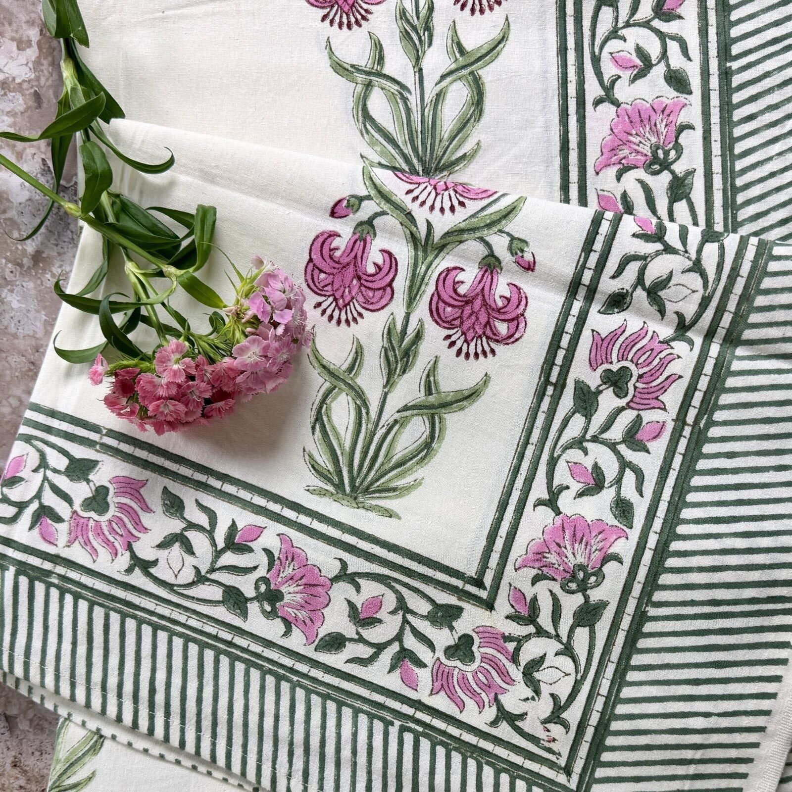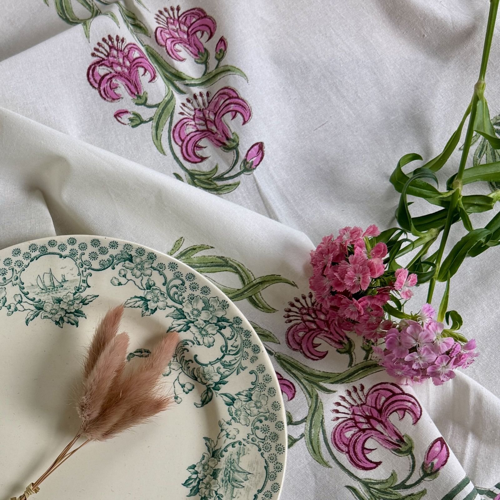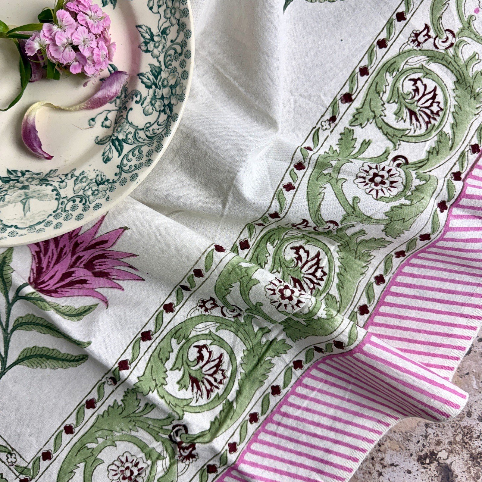 Nos nappes sont imprimées en toutes petites séries dans l’atelier familial de notre fabricant à Jaipur selon la technique ancestrale du blockprint (impression au tampon de bois).