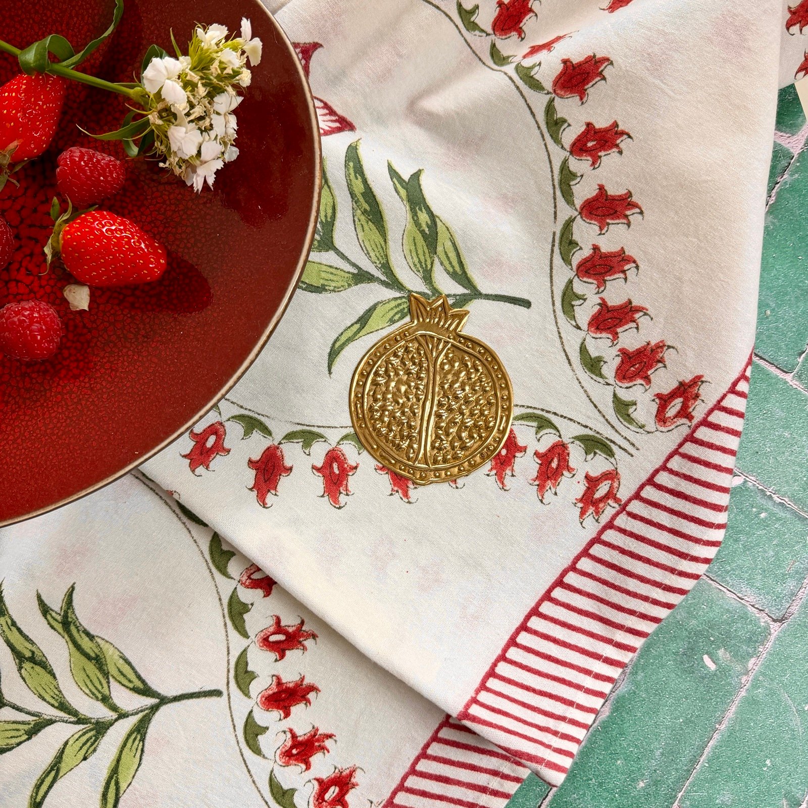 Nos nappes sont imprimées en toutes petites séries dans l’atelier familial de notre fabricant à Jaipur selon la technique ancestrale du blockprint (impression au tampon de bois).