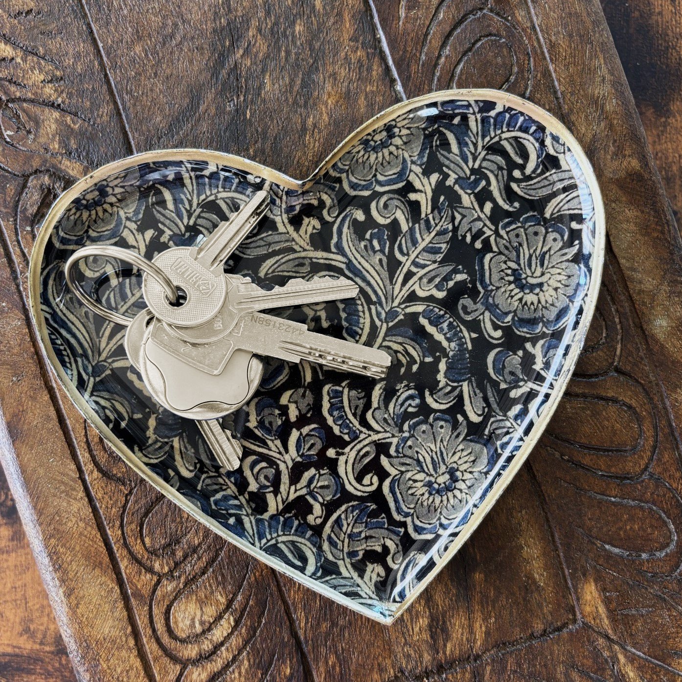 Plateau coeur métal émaillé Kalamkari, bordure dorée