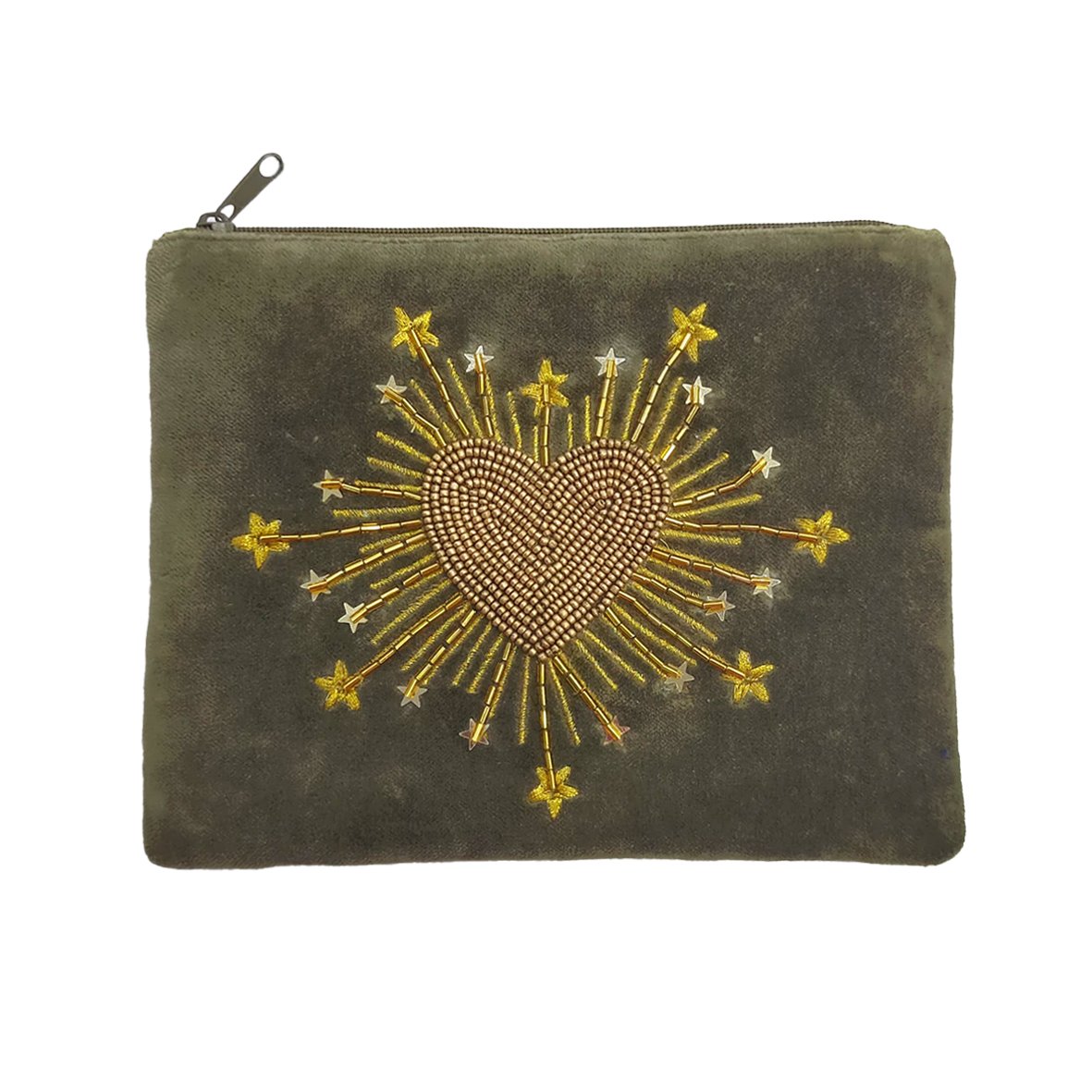 Pochette plate en très beau velours (100% coton) coloris kaki-vert de gris, brodée d’un motif ex-voto “coeur radieux” en perles de laiton, fil doré et étoiles en sequins.