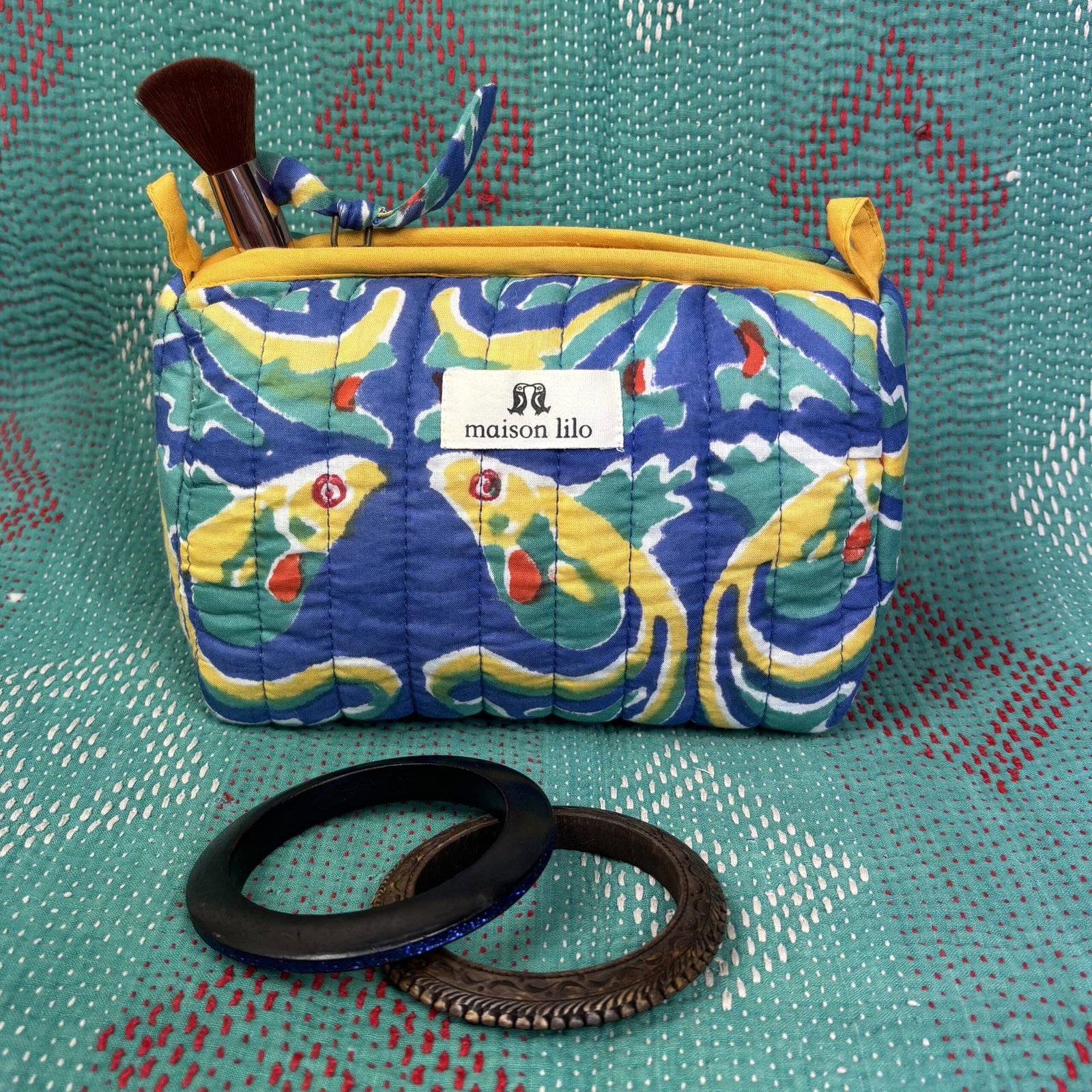 Trousses en coton imprimé artisanalement au tampon de bois d’un imprimé lumineux ‘à la Matisse” de poissons stylisés. Des couleurs qui font entrer le soleil dans la salle de bain !