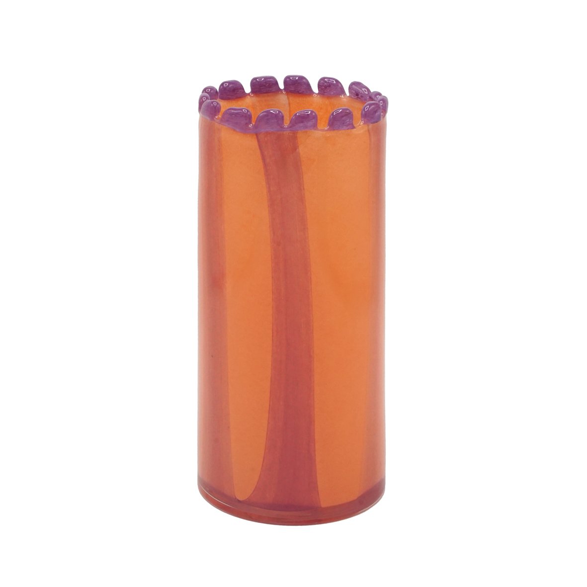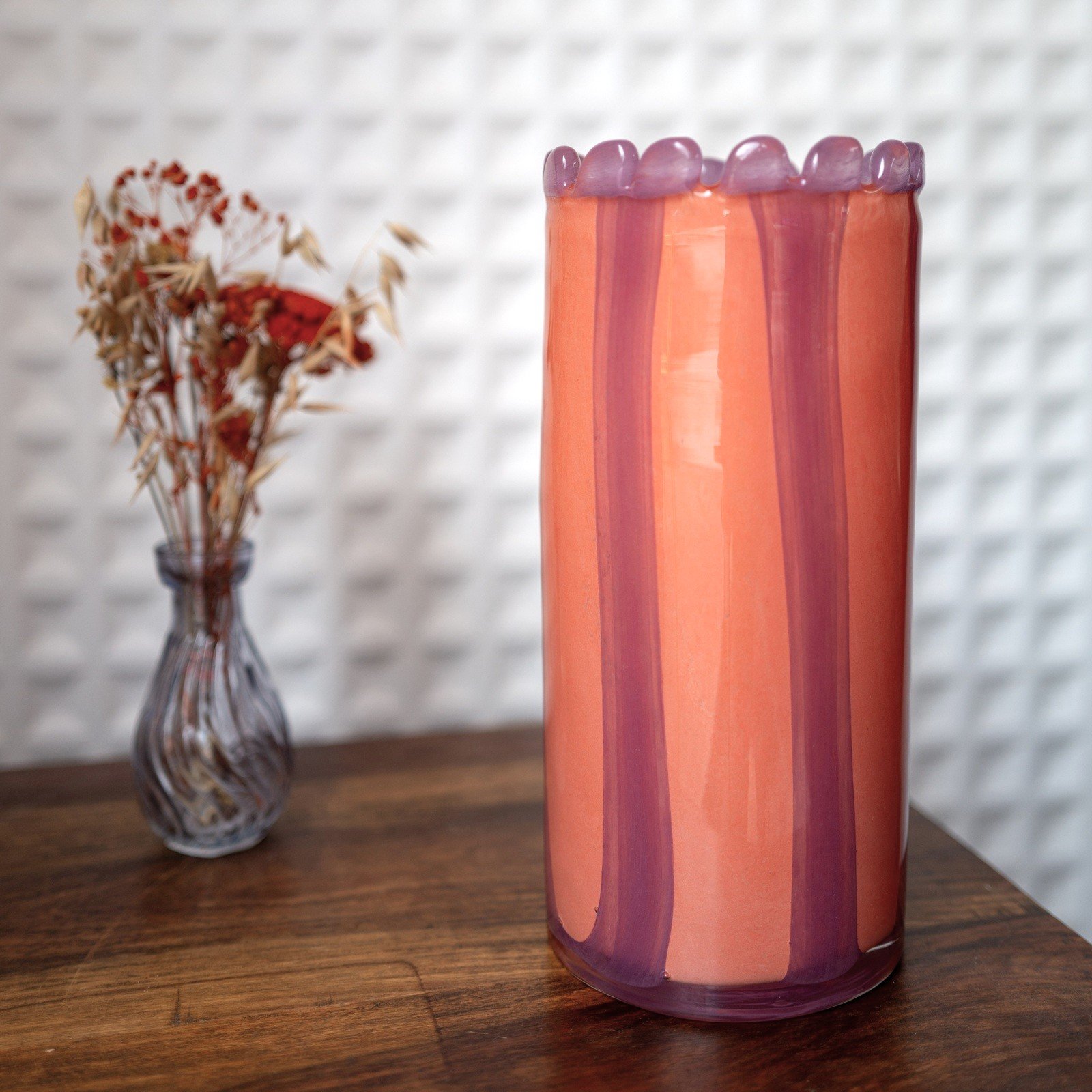 Vase en verre soufflé rayé goyave et lilas bord perlé