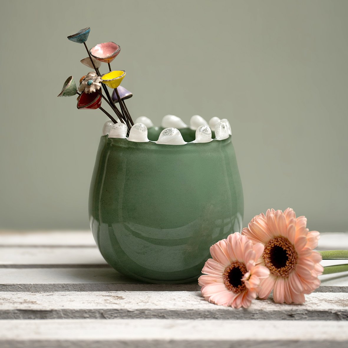 Vase en verre soufflé bouche artisanalement dans un joli coloris vert bordé de “perles” de verre blanches. Il accueillera des bouquets ronds, de fleurs fraîches ou séchées et sera un joli objet deco, seul ou en accumulation sur une console avec les autres modèles de la collection